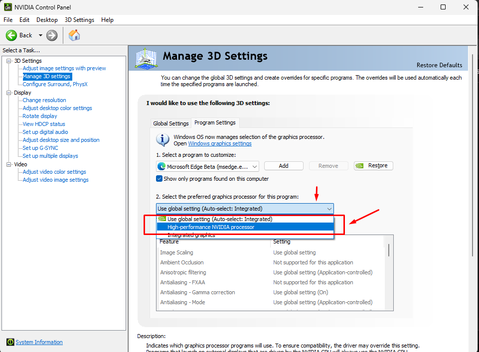 19. Choose High-performance NVIDIA processor from drop-down list as a preferred graphics processor for Edge browser