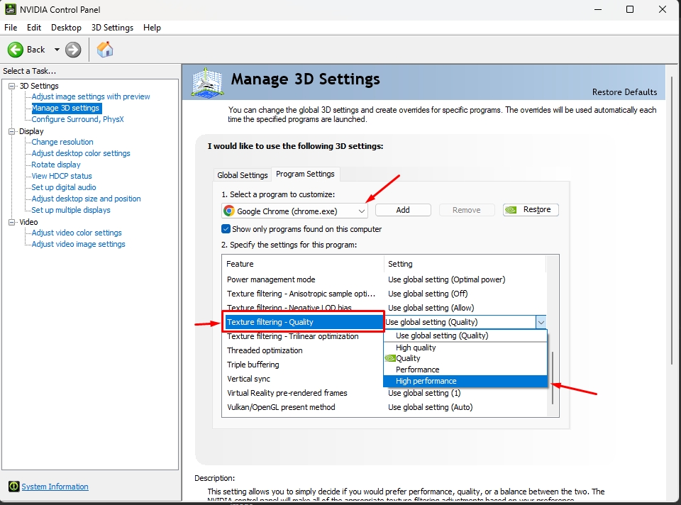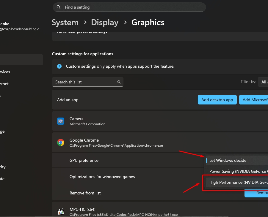 6. Choose High-performance NVIDIA processor from drop-down list as a preferred graphics processor for Chrome browser
