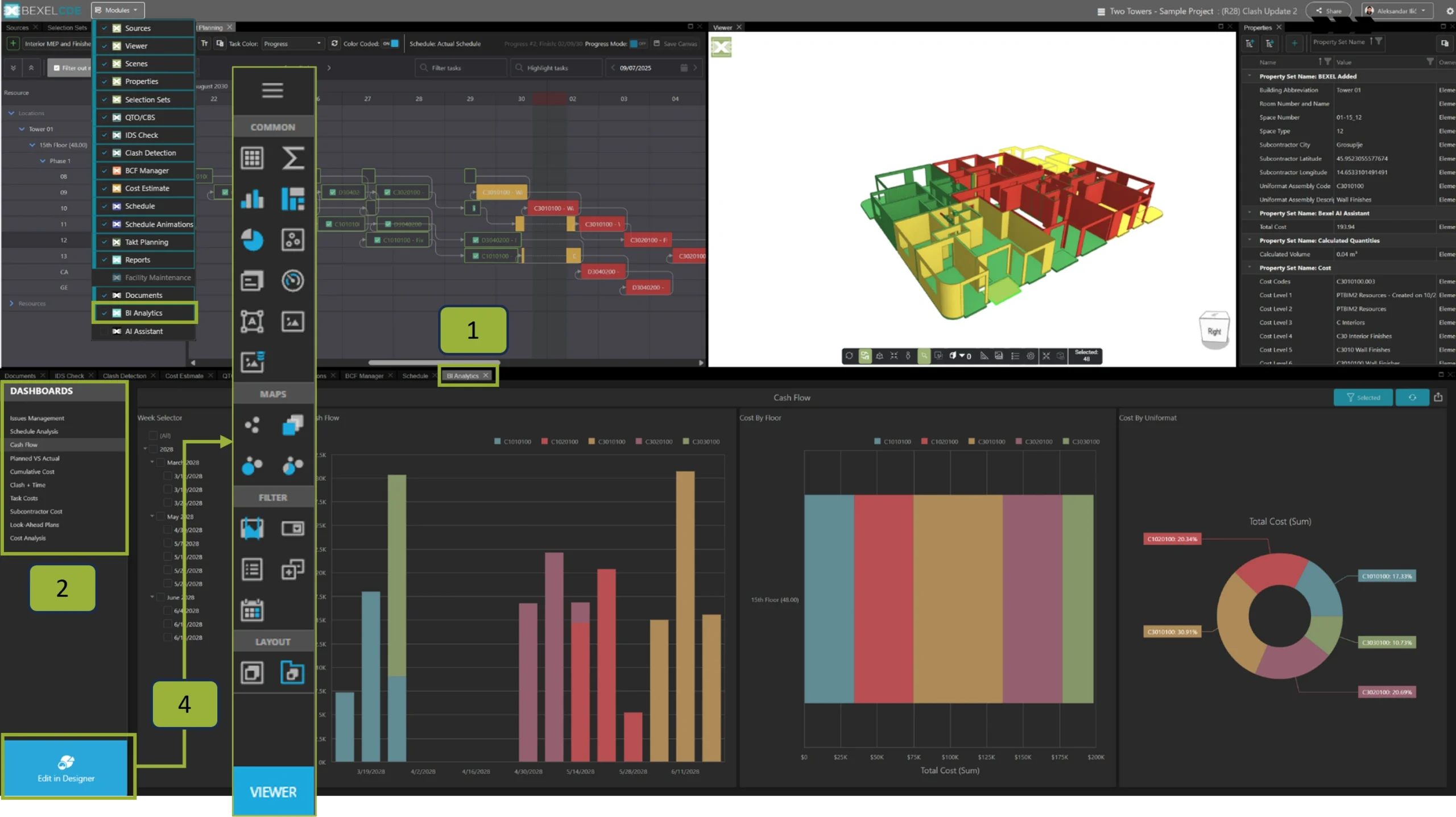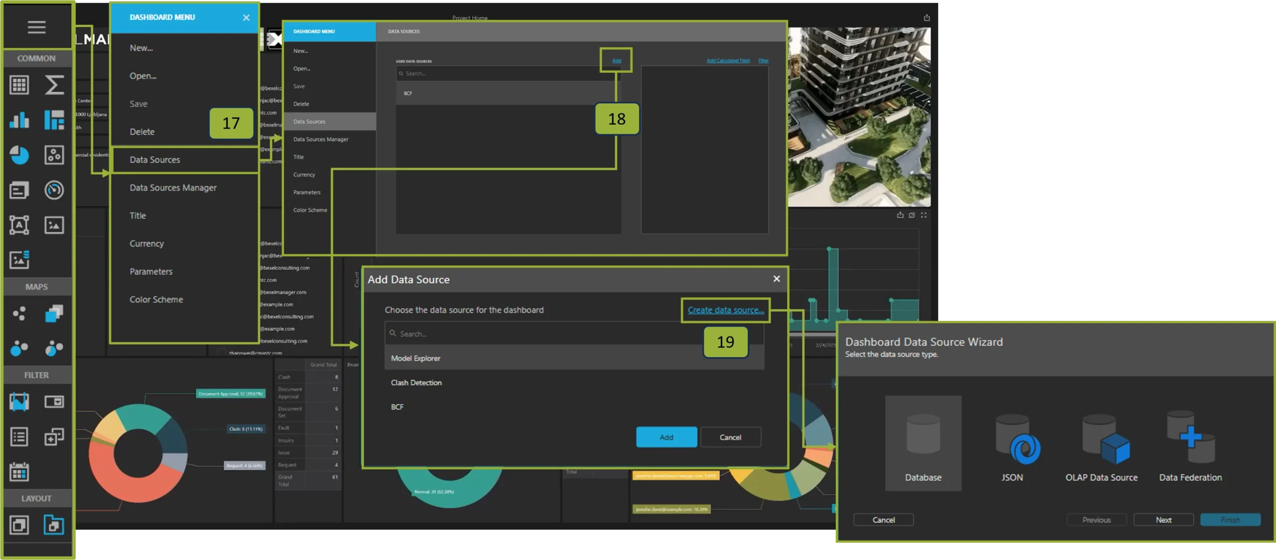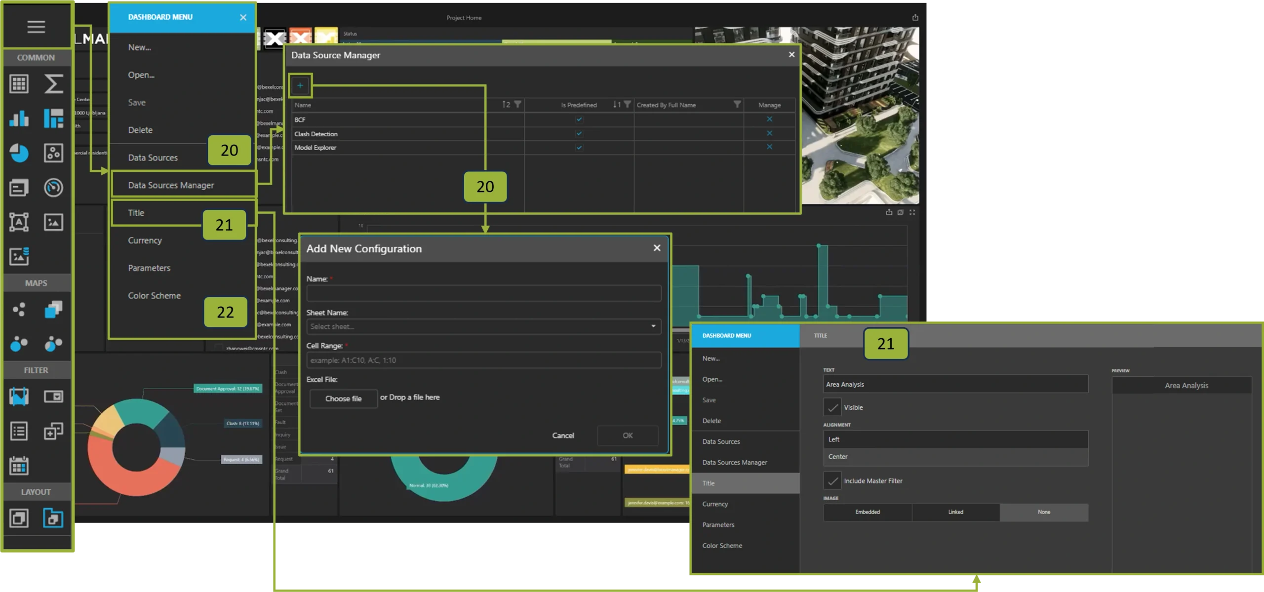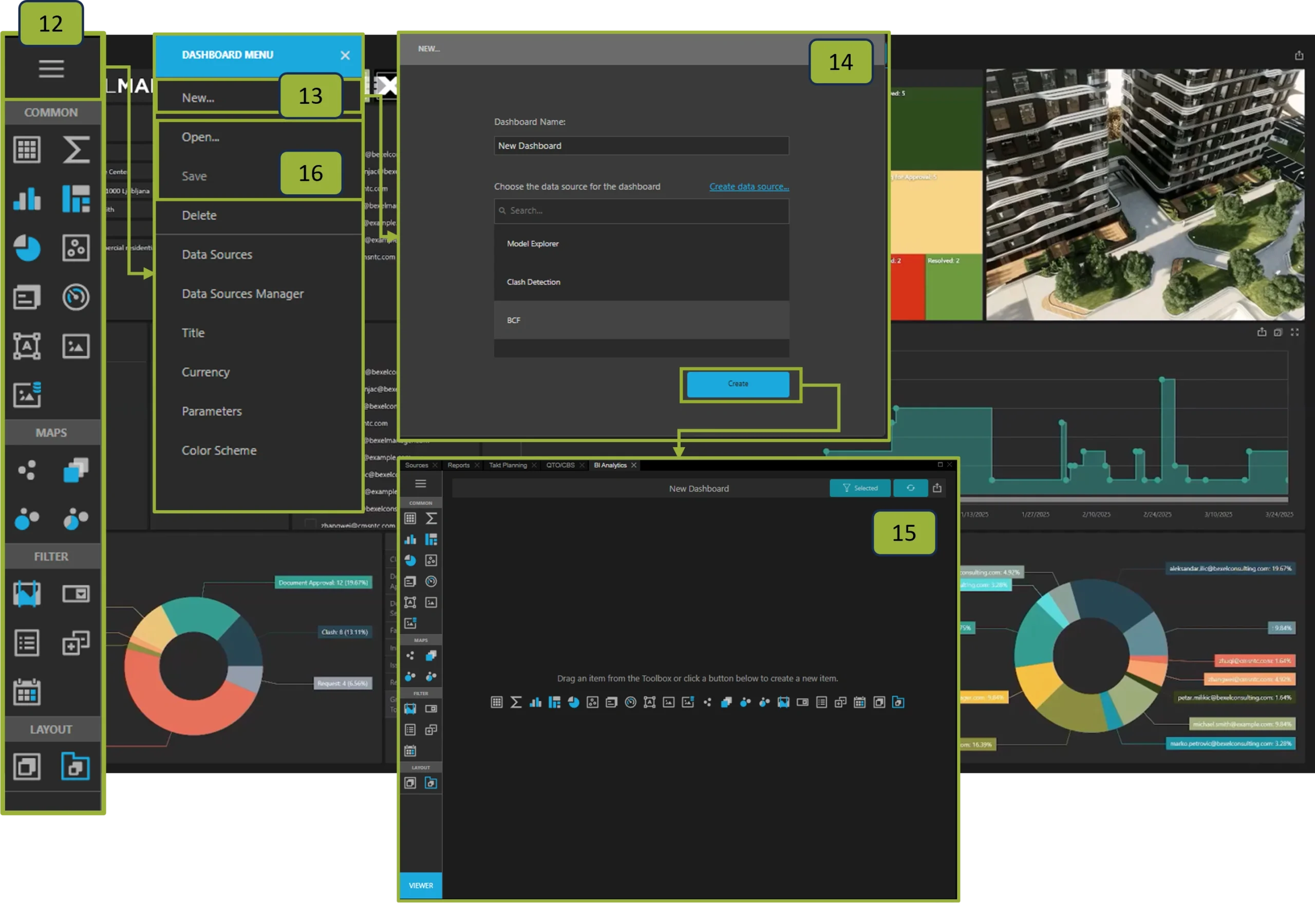 BI Analytics Estimated reading: 4 minutes The BI Analytics module in BEXEL CDE enables users to create fully interactive BIM dashboards directly within the platform. Reports can be generated and customized using data from supported domains such as Model Properties, Clash Detection, and BCF. The module can be accessed via Modules → BI Analytics. Dashboards are designed through the Edit in Designer interface, which offers configuration options similar to popular BI tools like Microsoft Power BI. Administrators can also create multi-project and multi-version BCF dashboards directly from the project list home page. 1. Navigate to the BI Analytics module to view project data presented in various BI dashboards2. The list of predefined dashboards is visible on the left-hand side3. When a dashboard is selected from the list, the corresponding data fields are shown on the right. Each predefined dashboard contains different data fields, which are populated based on project data and information from other CDE modules4. You can create a new dashboard or edit existing ones by clicking the Edit in Designer button in the lower-left corner Note The dashboards will remain empty if the project does not contain the required data for a specific dashboard. 5. In the Edit toolbox, you can easily insert new charts, grids, text boxes, images, maps, and other dashboard components by selecting the corresponding icons from the toolbox6. Click the icon for the desired chart or component to add a new data field to the dashboard7. To bind the item to data, click the hyperlink located in the middle of the page8. In the toolbox that appears, select the appropriate values. The added data field will then be populated with information from your project 9. When in Edit Dashboard mode, the Quick Edit menu appears on the right side of an item when you hover over it. From this menu, you can easily apply new data to the selected item, filter data, adjust interactivity settings, edit visualization options, or convert the chart to another type10. The BI Dashboards are interactive with the BIM model. By selecting model elements in the viewer, you can filter the dashboard data by clicking the Filter Selected button. To reload the dashboard, click the Reload button11. Dashboards can be exported as an image, Excel, or PDF file by selecting the desired option after clicking the Export To button 12. Click the three-line button at the top of the Edit menu to open the Dashboard menu13. To create a new dashboard from scratch, click the New button14. Enter a name for the new dashboard, select the data source, and click the Create button to generate the new dashboard15. You have full control over the dashboard layout and data fields, which can be easily added by dragging and dropping items from the Edit toolbox16. Dashboards created in one project can be saved and reused in another project, helping you save time and maintain consistency 17. New data sources can be added to the dashboard by clicking the Data Sources button in the Dashboard menu18. Click the Add button to open the Add Data Source menu, where you can either select an existing source from the list or create a new one by choosing the Create Data Source option19. To add a new data source from an existing database, select one of the options in the Dashboard Data Source Wizard and follow the guided steps 20. In the Data Source Manager menu, you can view a list of all defined data sources, manage existing ones, and add new sources by clicking the + button21. To edit the dashboard name, select the Title option in the Dashboard menu and choose your preferred settings from the menu22. Additional options available in the Dashboard menu include:Currency – Set the desired currency for your projectParameters – Define parameters relevant to your dataColor Scheme – Customize chart colors according to your preferences