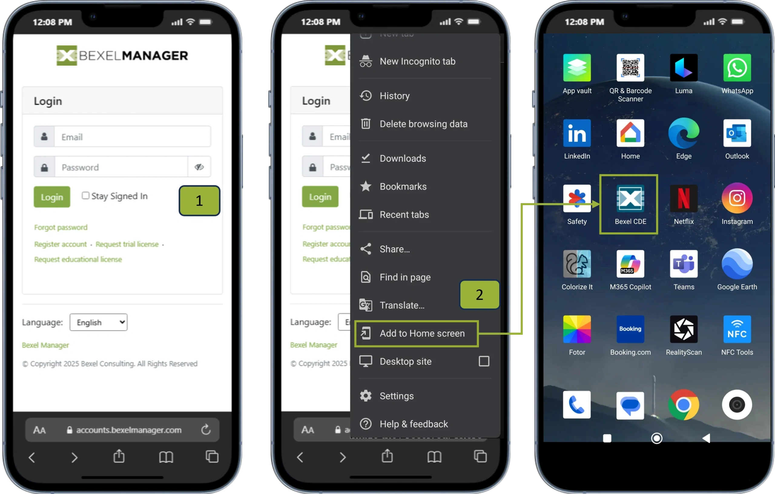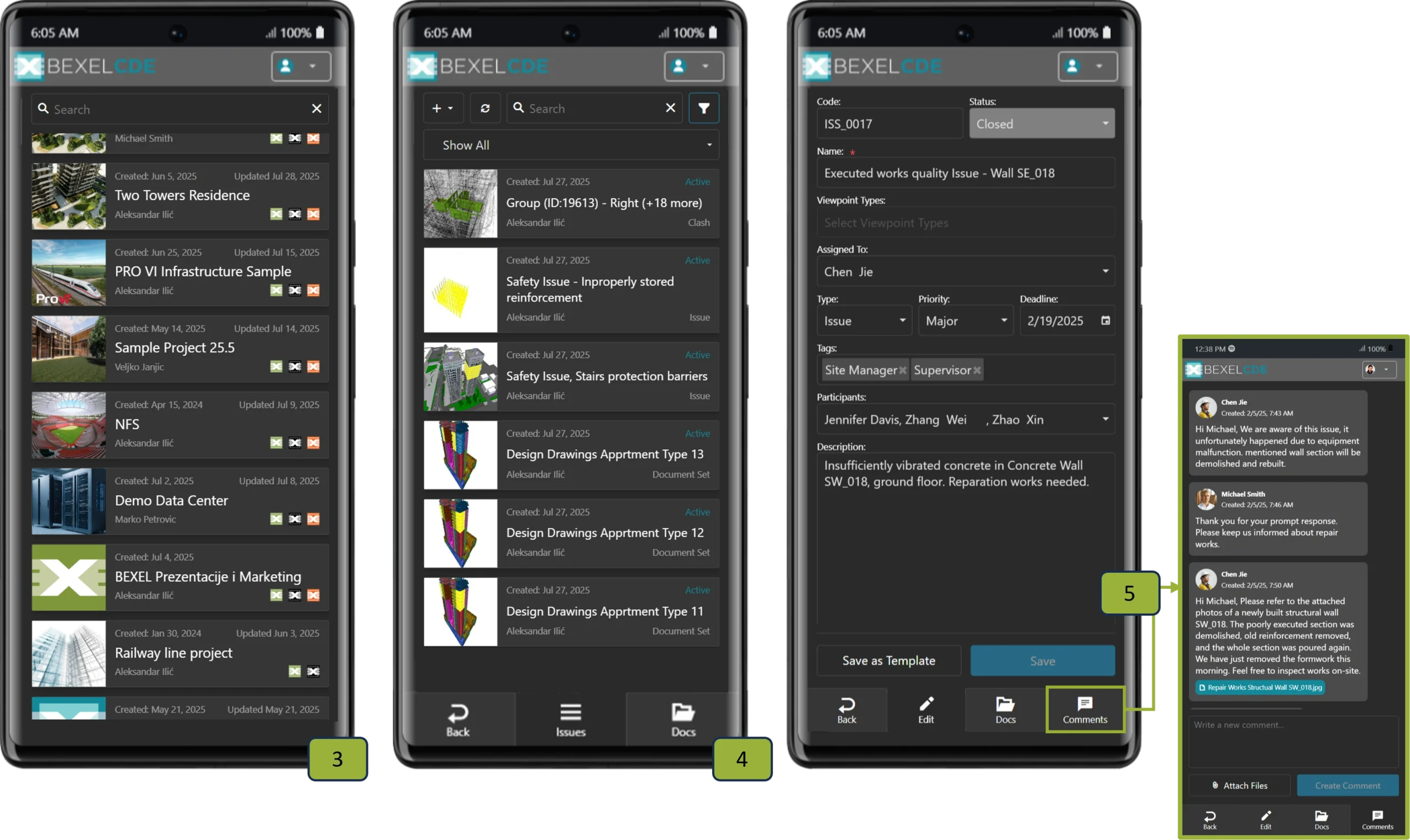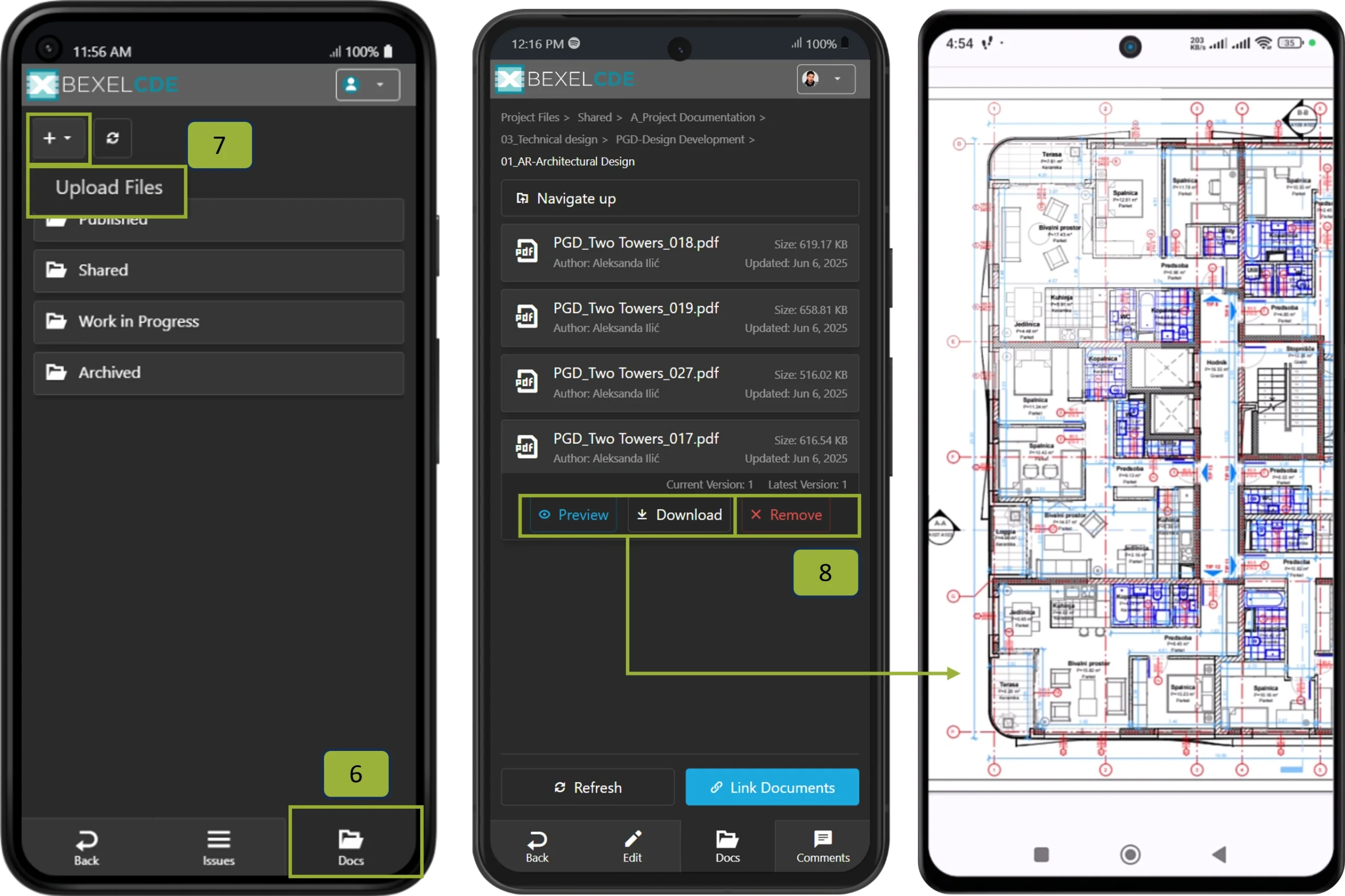 CDE Mobile Version Estimated reading: 2 minutes Mobile-optimized user interface for the BEXEL CDE is now available, designed for convenient access from mobile devices. The mobile version is automatically activated when accessing the CDE via a mobile device browser. After logging in, the list of available projects is shown. Once a project is selected, navigation is available to BCF Issues (default choice) and the Docs system. A “Request Desktop Site” option is also available at the browser tab/page level, allowing you to switch between the desktop and mobile interface as needed. 1. Open BEXEL CDE on your phone and log in with your credentials2. To add the BEXEL CDE icon to your homepage, open your browser settings and select the Add to Home Screen option. This allows you to access Bexel CDE quickly and easily whenever needed 3. After logging in, the list of available projects is displayed4. Once a project is selected, all BCF Issues created for that project are listed5. Tap on an issue to edit it. The mobile interface supports creating and editing BCF Issues, including comments and linked documents Tips and tricks Create or manage your project’s Safety or Quality Issues on-site using your phone. When creating a BCF Issue select a snapshot from your gallery or cloud storage or take a new photo directly with your device’s camera. For existing BCFs, snapshot preview and download are available. Also, document linking and adding comments are enabled once the issue is created. 6. Select the Docs icon in the bottom of the screen to navigate to the Document View7. Upload one or multiple files to the currently selected directory via the + button in the top-left corner is enabled, as well as to select a file to access with Preview and Download options available8. After selecting a document from the list, the options to Preview and Download are displayed. Depending on your user rights, the Remove button may also be available