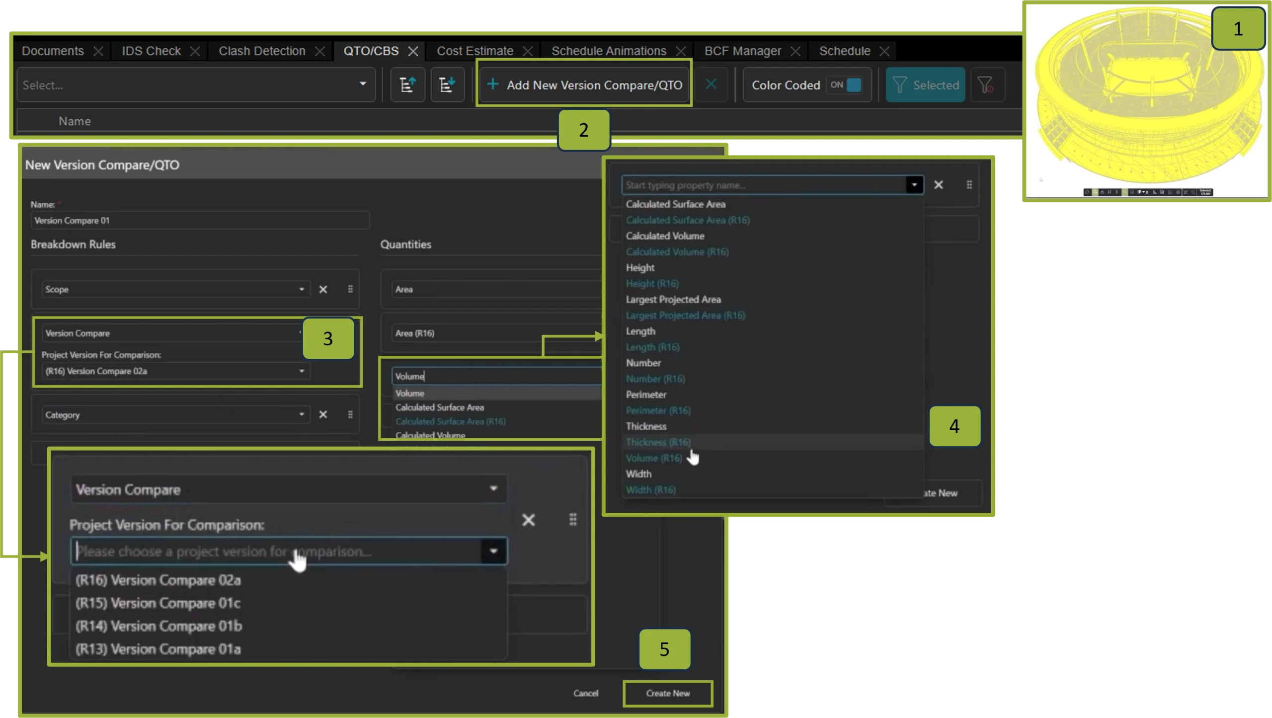 In the Version Compare/QTO module, you can compare two versions of a CDE project. After loading the model and selecting elements, the New Version Compare/QTO option becomes available. Within the menu, alongside the regular element groupings, you can apply a Version Compare Rule (highlighted in blue) at any grouping level. Once a project version for comparison is selected, the Version Compare Rule generates a breakdown tree.